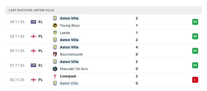- Phong độ gần đây Aston Villa