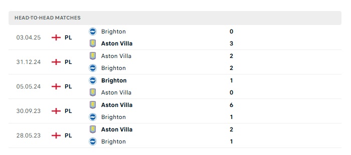Lịch sử đối đầu Brighton vs Aston Villa