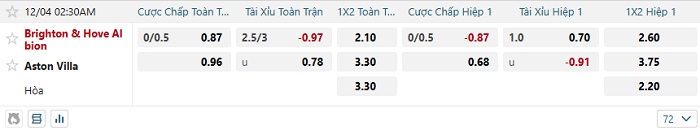 Bảng kèo nhà cái Brighton vs Aston Villa