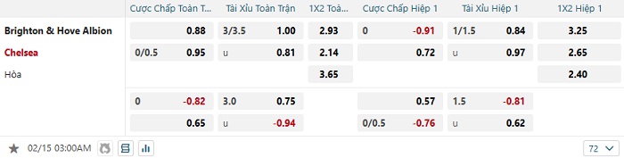 Bảng tỷ lệ kèo bóng đá Brighton vs Chelsea