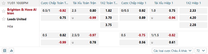 Soi kèo châu Á, kèo Brighton vs Leeds Utd
