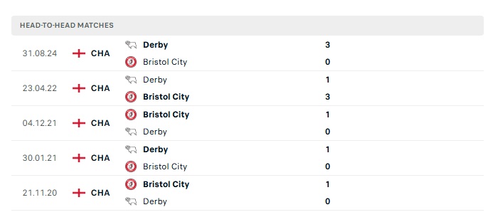 Lịch sử đối đầu Bristol City vs Derby County