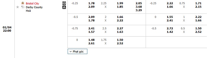Bảng tỷ lệ kèo bóng đá Bristol City vs Derby County