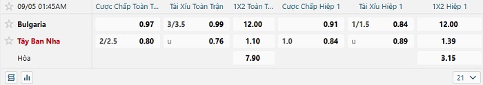 Bảng tỷ lệ kèo nhà cái Bulgaria vs Tây Ban Nha