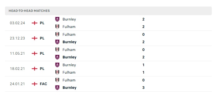Lịch sử đối đầu Burnley vs Fulham