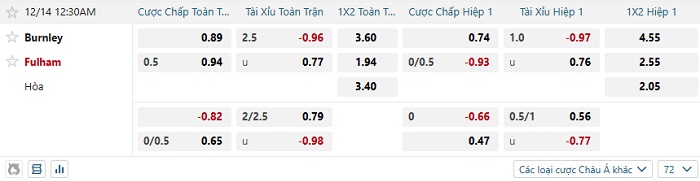 Bảng kèo bóng đá Burnley vs Fulham
