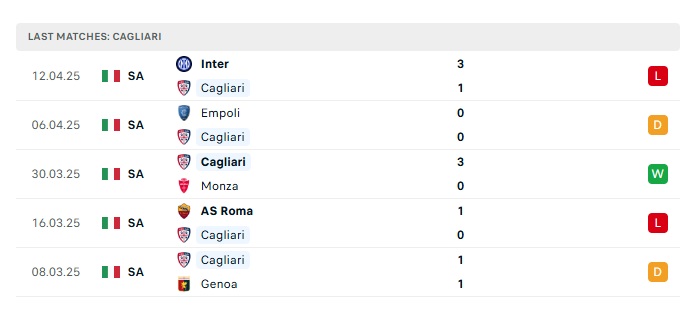 - Phong độ gần đây Cagliari