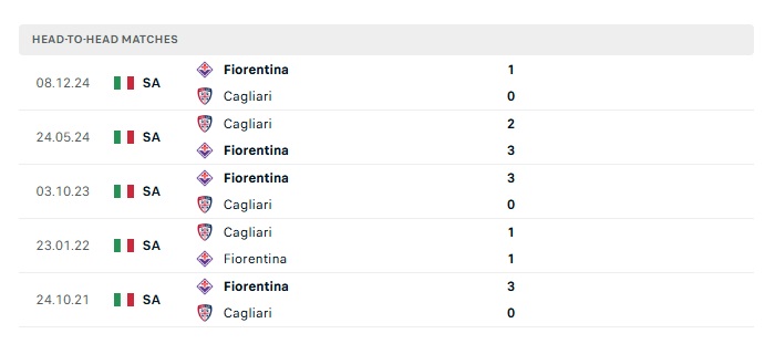 Lịch sử đối đầu Cagliari vs Fiorentina