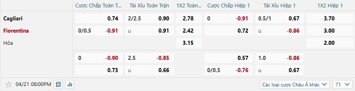 Bảng tỷ lệ kèo bóng đá hôm nay Cagliari vs Fiorentina