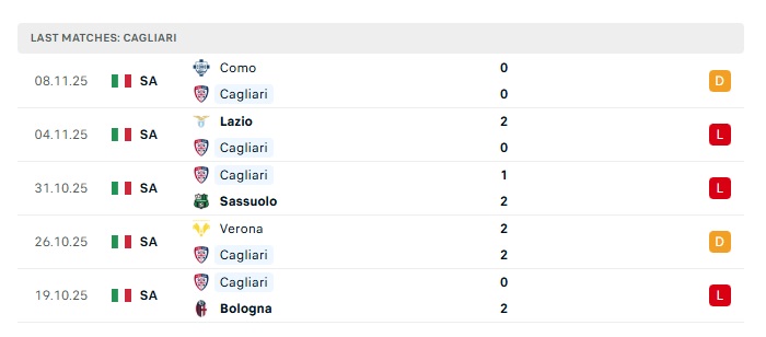 - Phong độ gần đây Cagliari
