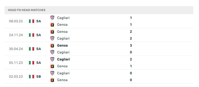 Lịch sử đối đầu Cagliari vs Genoa