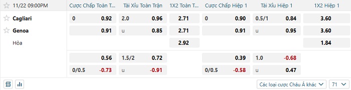Bảng kèo bóng đá Cagliari vs Genoa