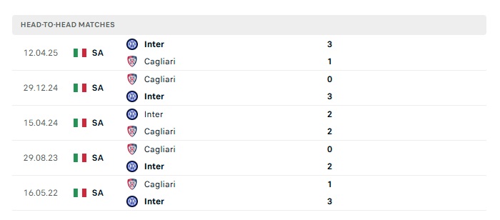 Lịch sử đối đầu Cagliari vs Inter Milan