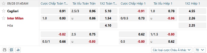 Bảng kèo bóng đá Cagliari vs Inter Milan