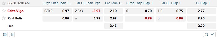 - Kèo tỷ số H1 Celta Vigo vs Betis: 0-0