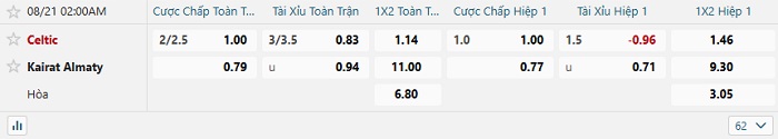 - Kèo tỷ số H1 Celtic vs Kairat Almaty: 2-0