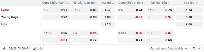 Bảng tỷ lệ kèo bóng đá Celtic vs Young Boys
