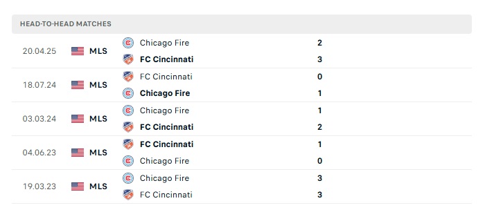 Lịch sử đối đầu Cincinnati vs Chicago Fire