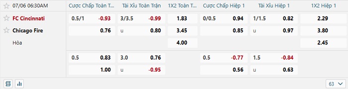 - Kèo tỷ số H1 Cincinnati vs Chicago Fire: 1-0