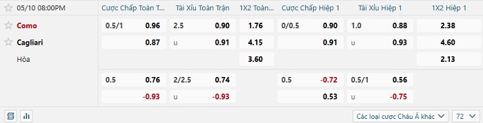 • Kèo tỷ số H1 Como vs Cagliari: 1-0