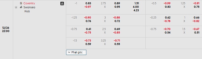 Bảng tỷ lệ kèo nhà cái Coventry vs Swansea City
