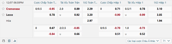 - Kèo tỷ số H1 Cremonese vs Lecce: 0-0