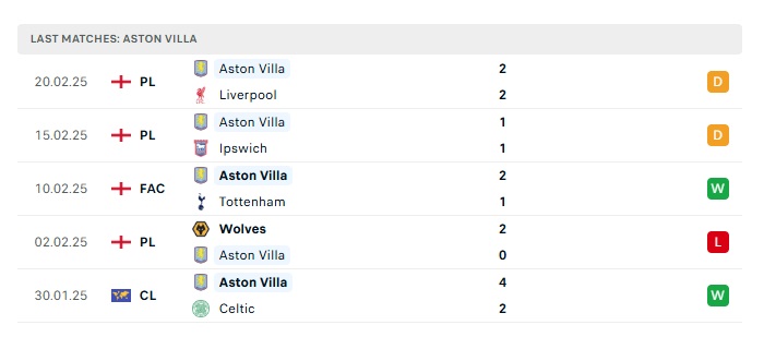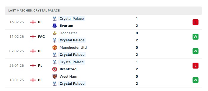Phong độ gần đây Crystal Palace vs Aston Villa