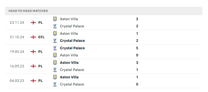 Lịch sử đối đầu Crystal Palace vs Aston Villa