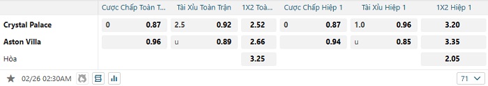 Bảng tỷ lệ kèo bóng đá Crystal Palace vs Aston Villa