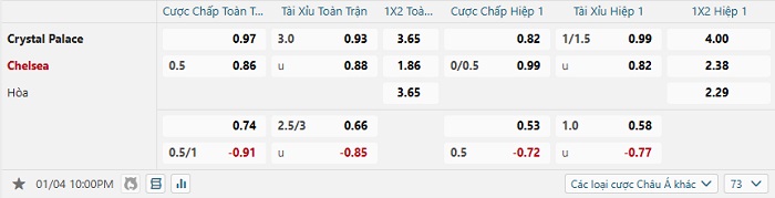 Bảng tỷ lệ kèo bóng đá Crystal Palace vs Chelsea