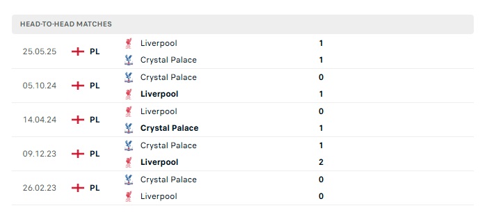 Phong độ gần đây Crystal Palace vs Liverpool