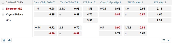 Bảng tỷ lệ kèo nhà cái Crystal Palace vs Liverpool