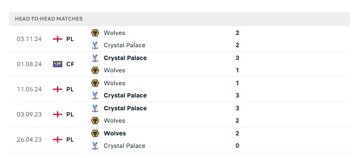 Lịch sử đối đầu Crystal Palace vs Wolves
