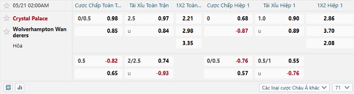 Bảng tỷ lệ kèo bóng đá Crystal Palace vs Wolves