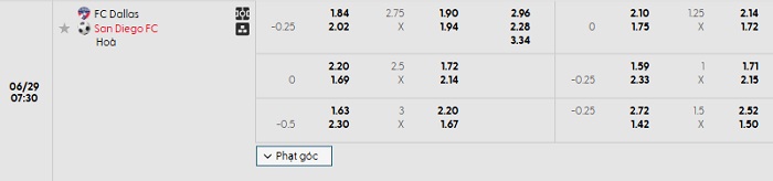 - Kèo tỷ số H1 Dallas vs San Diego: 0-0