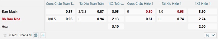 Bảng tỷ lệ kèo bóng đá Đan Mạch vs Bồ Đào Nha