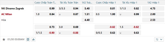 Bảng tỷ lệ kèo bóng đá Dinamo Zagreb vs AC Milan