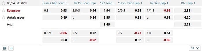 Bảng tỷ lệ kèo bóng đá Eyupspor vs Antalyaspor