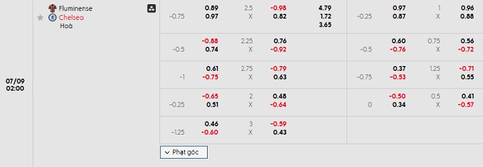 Bảng tỷ lệ kèo bóng đá Fluminense vs Chelsea