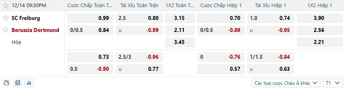 Bảng kèo bóng đá Freiburg vs Dortmund
