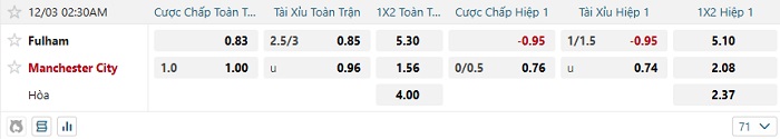 - Kèo tỷ số H1 Fulham vs Man City: 0-1