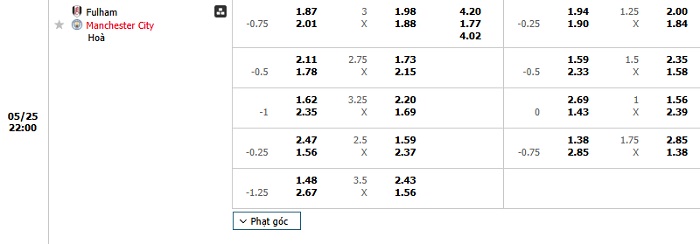Bảng tỷ lệ kèo nhà cái Fulham vs Man City