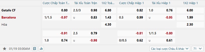 Bảng tỷ lệ kèo bóng đá Getafe vs Barcelona
