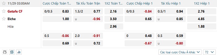 - Kèo tỷ số H1 Getafe vs Elche: 0-0