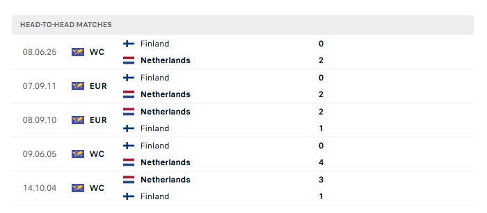 Lịch sử đối đầu Hà Lan vs Phần Lan