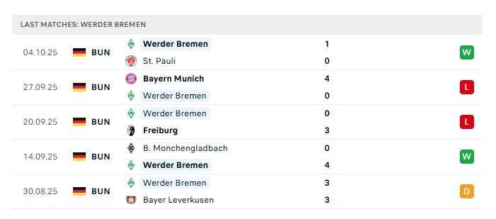 - Phong độ gần đây Werder Bremen