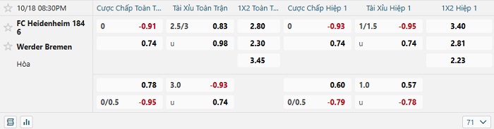 Bảng tỷ lệ kèo bóng đá Heidenheim vs Werder Bremen