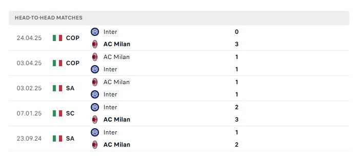 Phong độ gần đây Inter Milan vs AC Milan