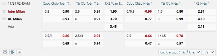 Bảng tỷ lệ kèo nhà cái Inter Milan vs AC Milan