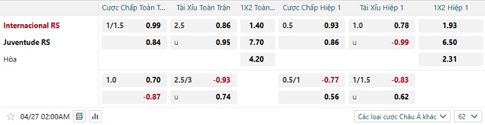 Soi kèo châu Á, kèo Internacional vs Juventude